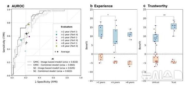 의사의 경력에 따른 분석에서는 경력 2년 미만 저경력 집단에서 11.6%의 가장 큰 정확도 향상이 나타났고, 경력 8년 이상 고경력 집단에서도 5.8%의 향상이 확인됐다. 또 사전 설문을 통해 AI에 대한 신뢰도가 높다고 분류된 집단에서 AI 진단 보조의 긍정적 효과가 더 크게 나타났으며, 신뢰도가 높다고 해서 AI의 잘못된 예측을 무비판적으로 따르는 경향이 증가하지는 않았다.