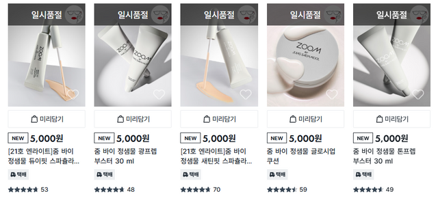 줌 바이 정샘물은 파운데이션, 쿠션, 픽서 등 베이스 메이크업 중심의 제품을 1000원~5000원 균일가로 선보인 것이 특징이다. 기존 정샘물 브랜드 제품이 2만원~5만원대에 형성돼 있는 점을 고려하면 가격을 최대 90%가량 낮춘 셈이다. 출시 직후 일부 매장에서는 베이스 제품을 중심으로 재고 소진 속도가 빨라지며 품절 사례가 잇따르기도 했다.