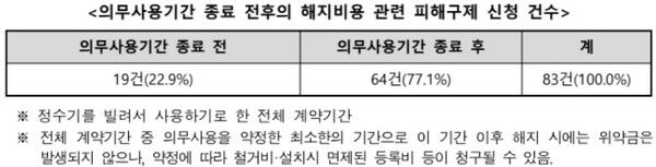 최근 3년 6개월간(’22년~’25년 6월) 한국소비자원에 접수된 정수기 렌탈 피해구제 신청 사례 83건을 분석한 결과, ‘의무사용기간 종료 후’ 제기된 피해구제 신청 비율이 77.1%(64건)로 나타나 ‘의무사용기간 종료 전’ 22.9%(19건)보다 세 배 이상 많았다.