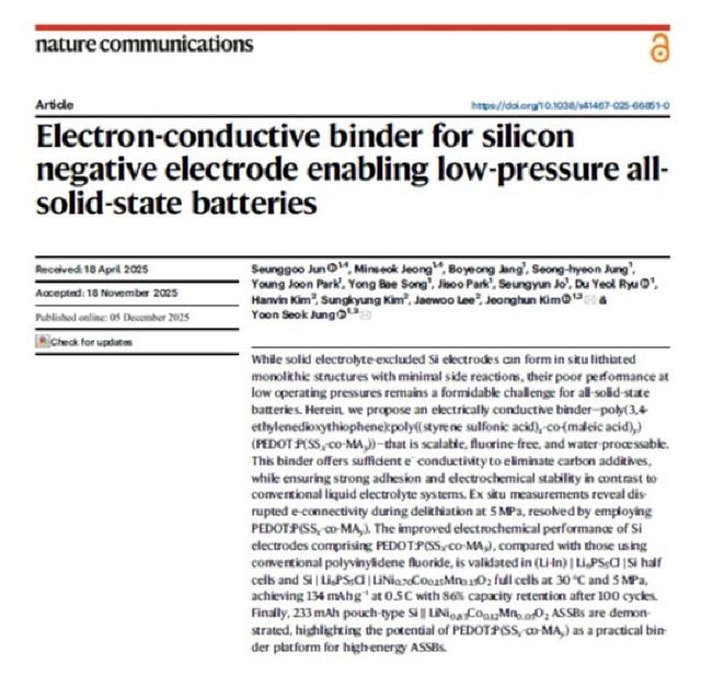 이번 연구 결과는 국제 학술지 '네이처 커뮤니케이션스(Nature Communications)'에 지난해 12월5일 게재됐다. 심사위원들은 이번 연구가 기존 액체 전해질 기반 배터리에서 활용이 제한됐던 전도성 고분자 바인더를 전고체 배터리 환경에서 안정적으로 구현하며 적용 범위를 넓혔다는 점에 주목했다.