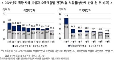 지역가입자는 1~2분위가 75.6%, 10분위가 60.5%로 약 15%p의 큰 격차가 확인됐다. 본인부담상한제가 저소득층의 의료비 부담 경감에 실질적 역할을 하고 있는 것으로 분석된다.