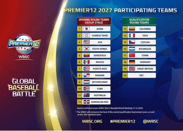 뉴시스 보도에 따르면, WBSC는 15일(한국 시간) 내년 프리미어12 본선에 참가하는 12개 팀과 예선 토너먼트를 치르는 7개 팀을 발표했다.