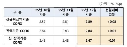 15일 은행연합회는 지난달 신규취급액 기준 코픽스가 2.89%로 전월(2.81%)대비 0.08%포인트 올랐다고 공시했다. 잔액기준 코픽스는 2.84%로 전월대비 0.01%포인트 상승했다. 신잔액기준 코픽스는 0.01%포인트 하락한 2.47%를 기록했다.