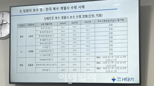 반면 한국은 이사회 보수 총액 한도에 대해서만 주주총회 승인을 받도록 돼 있고, 자본시장법에 따라 연 5억원 이상을 받는 상위 5명 임원에 한해 개인별 보수 총액과 산정 기준을 공시하는 구조다. 이 대표는 대기업집단 대주주가 여러 계열사를 겸직하는 경우 각 계열사에서 받는 보수 총액과 산정 근거를 파악하기 어렵고, 주식기준보상(RSU)의 경우 부여 시점에 소득으로 인정되지 않아 주총 승인 대상에서 빠지는 구조적 한계가 있다고 지적했다.