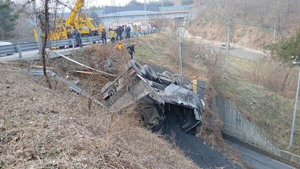 경찰은 덤프트럭이 커브길 주행 중 미끄러져 가드레일을 들이받고 추락·전복된 것으로 보고 정확한 사고 경위를 조사 중이다.