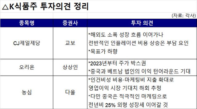 조상훈 신한투자증권 연구원은 “국내 시장의 양적 한계가 명확해진 상황에서 해외 진출은 선택이 아닌 필수”라며 “식품주가 방어주가 아닌 수출 주도주로서의 면모가 부각되는 시점이다. 내수 중심에서 수출 기업으로 변신 중인 기업들에 기회 요인이 많다”고 설명했다.