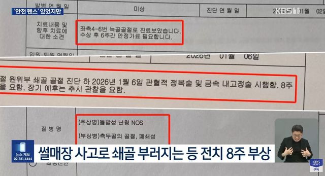 당시 안전 펜스 주변에는 눈이 쌓여 있었고, 진 씨는 눈더미로 형성된 둔덕을 타고 펜스 밖으로 튕겨 나가 맨바닥으로 떨어졌다. 이 사고로 진 씨는 쇄골 골절과 일시적 청력 손실 등 전치 8주의 부상을 입고 병원 치료를 받고 있다.