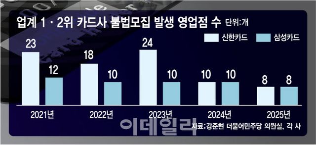 연도별로 보면 신한카드에서는 2021~2023년 불법 모집 사례가 자주 적발됐다. 2021년 23곳, 2023년 24곳, 지난해는 8곳의 영업점이 각각 불법 모집이 일어난 것으로 나타났다. 삼성카드에서는 2022~2024년 매년 10곳의 영업점에서 불법 모집이 발생해 적발됐고 지난해 8곳으로 각각 집계됐다.