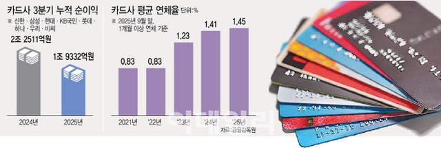 금융감독원에 따르면 신한·삼성·현대·KB국민·롯데·하나·우리·비씨카드 등 8개 전업카드사의 지난해 3분기 누적 순이익은 1조9332억원으로 집계됐다. 전년 동기 대비 14.1% 감소한 규모다. 현대카드를 제외한 7개 카드사의 순이익이 일제히 줄었다. 이 추세가 이어질 경우 지난해 연간 실적은 레고랜드 사태의 직격탄을 맞았던 2022년 이후 가장 낮은 수준으로 떨어질 가능성이 크다는 관측도 나온다.