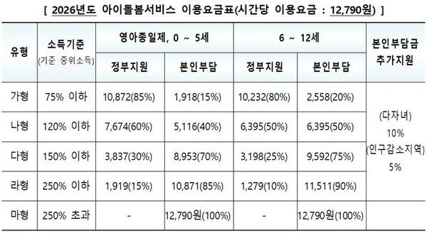 또 한부모·조손·장애·청소년부모 가구 등 돌봄 부담이 큰 가구에 대해서는 정부 지원 시간을 확대해, 기존 연 960시간에서 120시간 추가한 1080시간까지 이용할 수 있다.