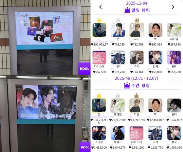 진의 기록은 월간 집계 과정에서도 뚜렷했다. 12월 4일 생일 당일 하루에만 1억9207만2379표를 기록하며 일일 랭킹 1위를 차지했고, 12월 1일부터 7일까지 집계된 주간 랭킹에서도 1억9821만6995표로 정상에 올랐다. 이어 월간 집계 마감일인 12월 31일에는 2억1320만5263표를 추가하며 12월 월간랭킹 1위를 확정지었다.