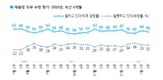 한국갤럽이 지난 13~15일 전국 만 18세 이상 1000명을 대상으로 전화조사원 인터뷰(CATI) 방식으로 조사한 결과, 이 대통령의 국정수행 평가에서 긍정 응답은 58%로 집계됐다. 부정 응답은 32%였다. 10%는 의견을 유보했다. 전주 대비 지지율은 2%포인트 하락했다. 부정 평가는 1%포인트 떨어졌다.