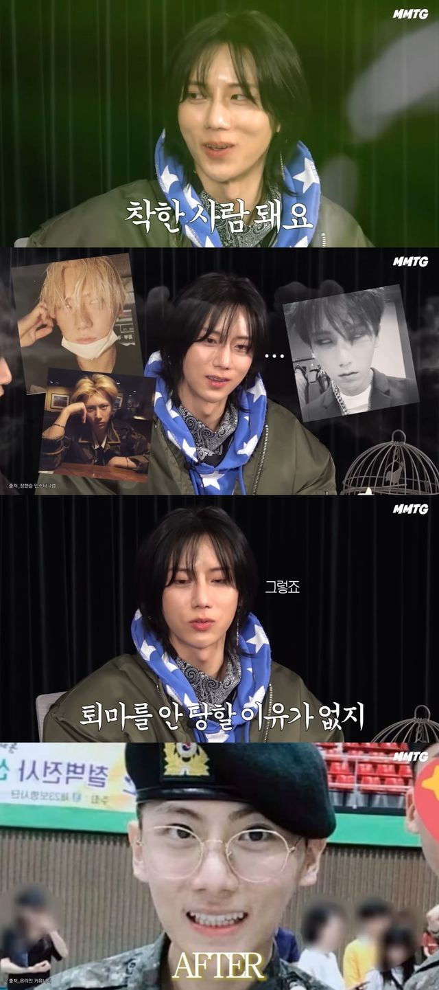 MC 재재는 "유명하게 (인터넷에) 돌았던 게, 군대를 다녀온 이후로 완전히 '퇴마'를 당했다더라. 눈빛이 맑아졌다"며 군 제대 전후 차이를 언급했다.