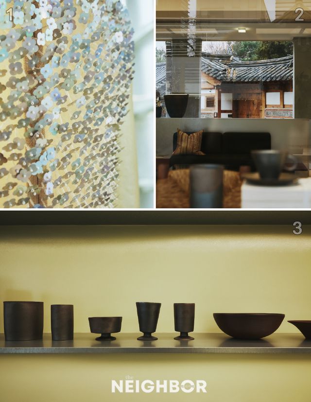1 비즈로 구성한 무지갯빛 꽃자수. 2 창 너머로 한옥 풍경이 들어오는 엄버 포스트파스트 홈. 3 엄버 포스트파스트와 담화헌의 제주 옹기 협업 컬렉션. 제주 옹기 흙을 장작 가마에서 구워냈다.