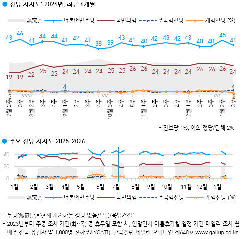 한국갤럽이 지난 13~15일 전국 만 18세 이상 남녀 1000명을 대상으로 정당 지지율 조사를 실시한 결과(95% 신뢰수준에 ±3.1% 포인트) 민주당 41%, 국민의힘 24%, 개혁신당 4%, 조국혁신당 3%,진보당 1% 등으로 나타났다.