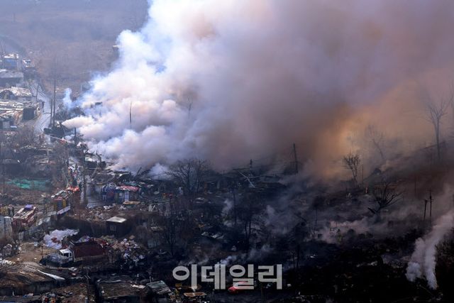소방당국에 따르면 16일 오전 11시 34분께 구룡마을에서 발생한 화재의 초진이 완료됐다. 화재 발생 6시간 34분만이다.