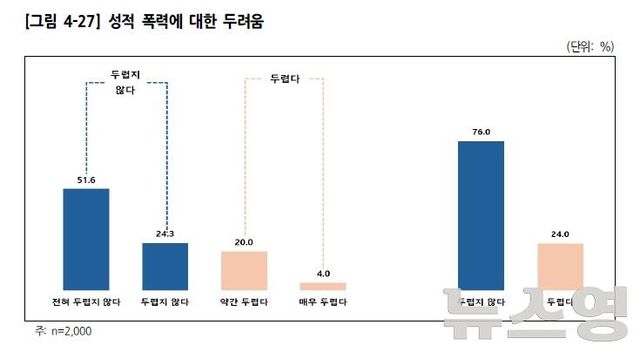 '성추행이나 성폭력 피해에 대한 두려움'(24.0%)도 높은 수준으로 나타나, 적어도 여성 4명 중 1명은 일상적으로 성적 폭력에 대한 두려움을 느끼고 있었다.