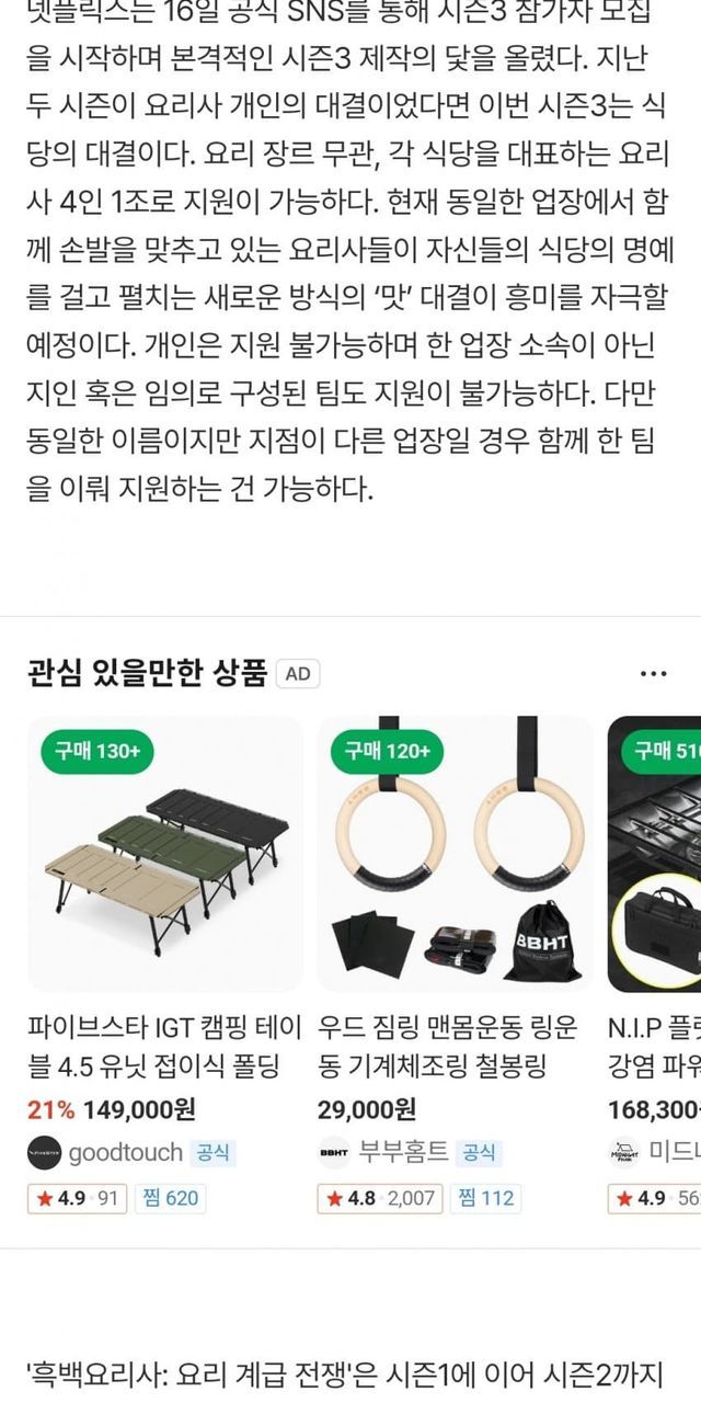 이날 넷플릭스는 16일 공식 SNS를 통해 시즌3 참가자 모집을 시작했다. 지난 두 시즌이 요리사 개인의 대결이었다면 이번 시즌3는 식당의 대결이다. 요리 장르 무관, 각 식당을 대표하는 요리사 4인 1조로 지원이 가능하다. 현재 동일한 업장에서 함께 손발을 맞추고 있는 요리사들이 자신들의 식당의 명예를 걸고 펼치는 새로운 방식의 ‘맛’ 대결이 흥미를 자극할 예정이다.
