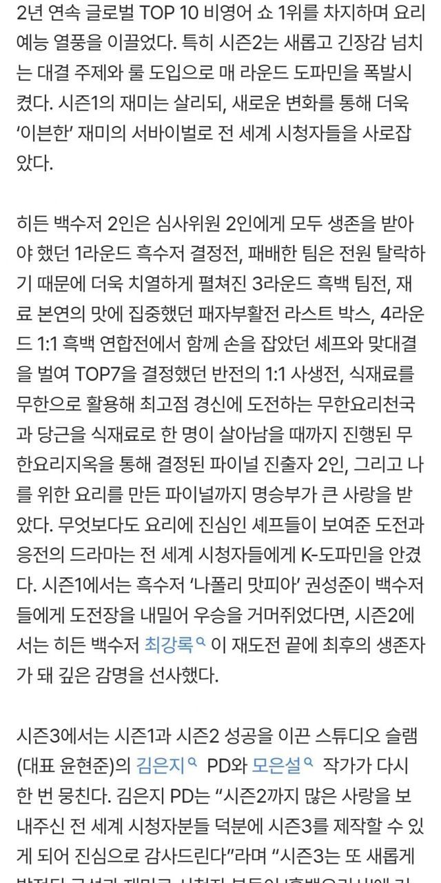 무엇보다도 요리에 진심인 셰프들이 보여준 도전과 응전의 드라마는 전 세계 시청자들에게 K-도파민을 안겼다. 시즌1에서는 흑수저 ‘나폴리 맛피아’ 권성준이 백수저들에게 도전장을 내밀어 우승을 거머쥐었다면, 시즌2에서는 히든 백수저 최강록이 재도전 끝에 최후의 생존자가 돼 깊은 감명을 선사했다.