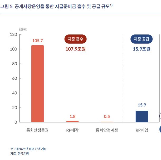 지난해 RP매입 규모가 늘어난 점은 지급준비금 변동성 확대에 대응해 양방향 RP매매를 도입했기 때문이라고 짚었다. 그는 “지난해 한은은 평균잔액 기준 107조 9000억원의 지급준비금을 흡수했다”면서 “RP매입 규모 증가는 일시적인 지준 변동에 탄력적으로 대응하기 위해 매입을 정례화한 데에 기인한다”고 했다.