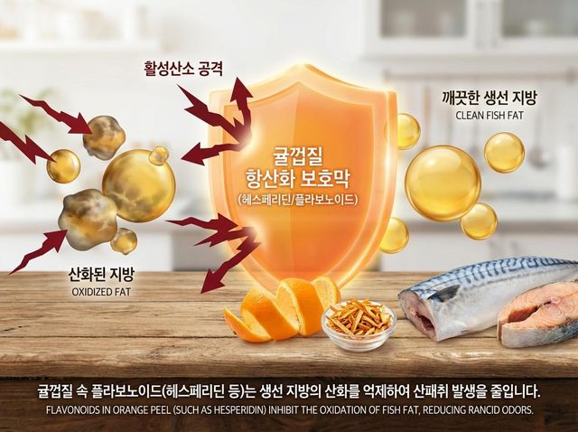 귤꺼ㅃ질 속 플라보노이드는 생선 지방의 산화를 억제해 불쾌한 냄새 발생을 줄여준다. 기사 내용 토대로 AI툴 활용해 제작한 자료사진.