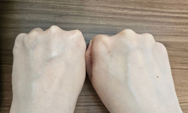 수퍼폼 갈바닉 부스터를 사용한 손(왼쪽)과 사용하지 않은 손을 비교해 봤다. 사용한 손은 피부결이 정돈되고 광채가 돌았다. = 박지혜 기자