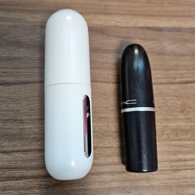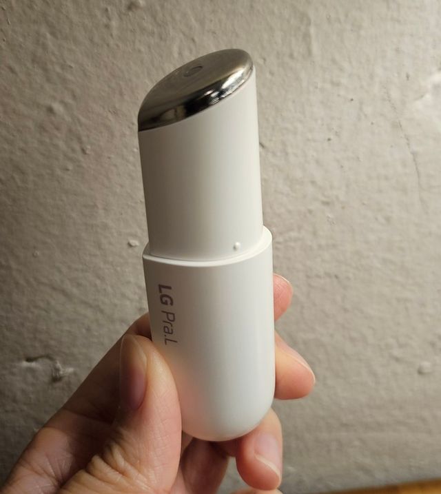 LG 프라엘 수퍼폼 갈바닉 부스터는 맥 립스틱(오른쪽)보다 조금 크다. = 박지혜 기자