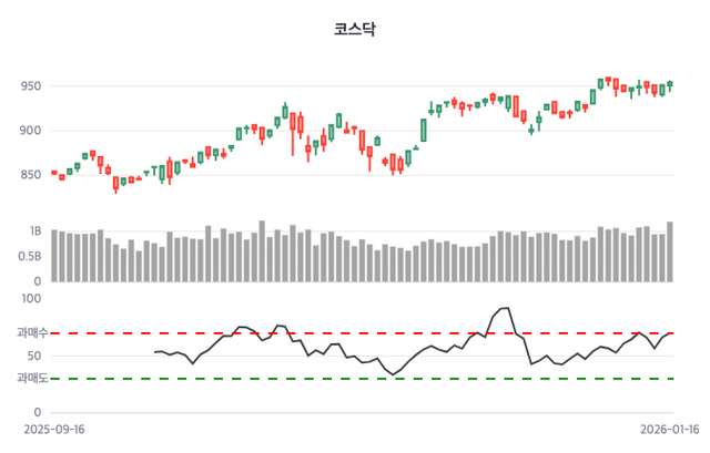 코스닥 지수는 이날 950.83에 출발해 956.23을 고점으로 기록한 뒤 954.59로 거래를 마쳤다. 전거래일 대비 3.43포인트(0.36%) 상승했고, 시작가보다는 3.76포인트(0.40%) 상승했다.