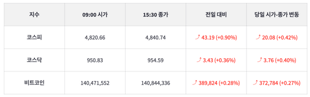 금일 코스피와 코스닥은 연일 랠리를 보였다. 특히 코스피는 11거래일 연속 상승하며 다시 한 번 최고치를 경신했다. 기관과 외인의 순매수로 4840선에 안착시키며 오천피를 목전에 두고 있다. 코스닥 또한 코스피와 커플링으로 상승을 보였다. 개인과 기관 순매수로 950선에 안착시키며 코스닥 또한 천스닥을 목전에 두고 있다.