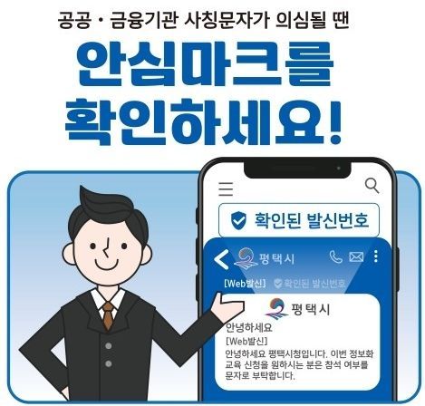 기존 문자메시지는 발신 번호만 표시되어 스미싱 문자와 구분이 어려웠으나, 새로운 ‘안심문자서비스’는 ▲평택시 로고 ▲기관 명칭 ▲인증 안심 마크가 함께 표시된다. 이를 통해 시민들은 공식 발신 여부를 한눈에 파악할 수 있어 사기전화(보이스피싱) 및 스미싱 피해를 효과적으로 예방할 수 있을 것으로 기대된다.