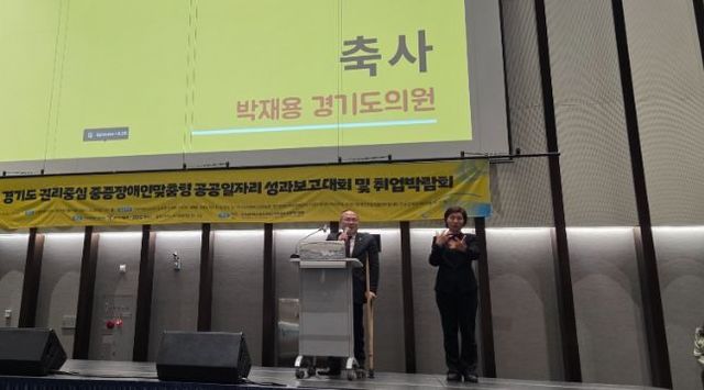 [와이뉴스] 경기도의회 보건복지위원회 박재용 의원(더불어민주당, 비례)은 16일, 수원컨벤션센터에서 열린 ‘2025년 경기도 권리중심 중증장애인맞춤형 공공일자리 성과보고대회 및 취업박람회’에 참석해 축사를 전하고, 중증장애인의 노동권 보장과 권리중심 공공일자리 정책의 지속적인 발전 필요성을 강조했다.