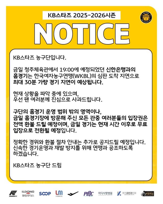 WKBL은 공지를 통해 “금일 경기 운영과 관련해 심판진 도착이 지연되는 상황이 발생했다”면서 “이에 부득이하게 경기 시작 시간을 변경하게 됐다”고 알렸다. 이어 “예기치 못한 일정 변경으로 불편을 드린 점에 대해 경기를 기다려주신 팬 여러분과 양 팀 선수단 및 관계자분들께 깊이 사과드린다”고 고개를 숙였다. WKBL에 따르면 심판 배정을 전달하는 과정에서 소통 오류가 발생, 이후 대체 심판을 섭외하느라 시작이 지연된 거로 알려졌다.