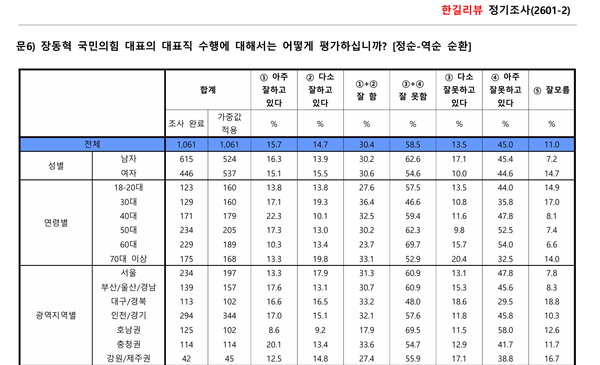 여론조사 전문기관 한길리서치가 쿠키뉴스 의뢰로 지난 10~12일 전국 만 18세 이상 남녀 1061명을 대상으로 '장동혁 당대표의 직무수행'을 평가한 결과, 부정 평가가 58.5%로 집계됐다. 세부적으로는 '아주 잘못함' 45.0%, '다소 잘못함' 13.5%였다. 반면 긍정 평가는 30.4%로, '아주 잘함' 15.7%, '다소 잘함' 14.7%로 나타났다.