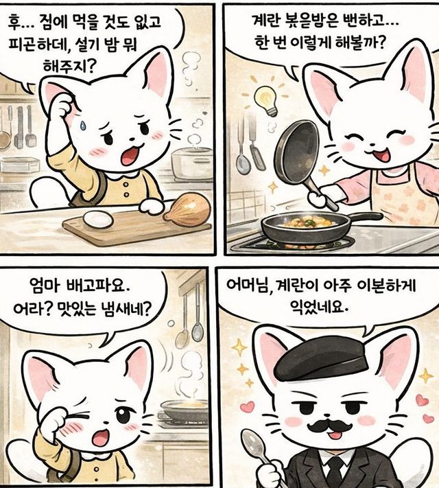 재료는 계란, 즉석밥, 굴소스, 양조간장, 크래미, 팽이버섯, 대파, 설탕, 전분이다. 요리는 즉석밥을 전자레인지에 2분간 돌리는 것으로 시작된다.