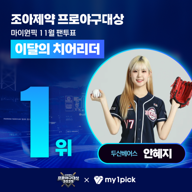 두산베어스의 안혜지 치어리더가 '조아제약 프로야구 대상' 11월 이달의 선수 팬 투표에서 48%의 득표율로 1위를 차지했다. 본 투표는 KBO 리그 소속 치어리더를 대상으로 최다 득표자를 선정하는 방식으로 진행됐다. 월간 누적 점수는 연말 시상식인 '조아제약 프로야구대상의' 인기 치어리더상 부문에 반영됐다.