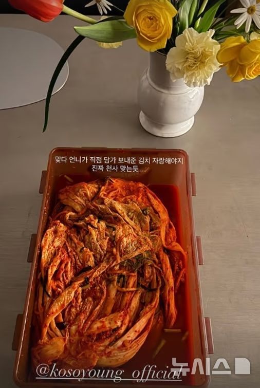 뉴시스 보도에 따르면, 효민은 16일 자신의 사회관계망서비스(SNS)에 "맞다. 언니가 직접 담가 보내준 김치 자랑해야지. 진짜 천사 맞는듯"이라는 글과 함께 사진을 올렸다.