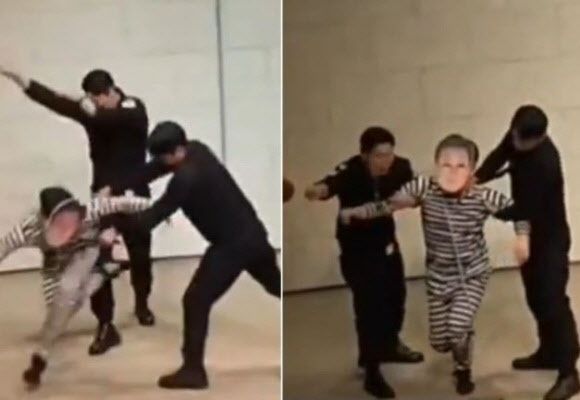 곤봉을 든 두 사람이 가면 쓴 이를 끌고 나왔다. 양옆 두 사람은 “사죄하라”고 외치면서 이 대통령 가면을 쓴 사람을 발로 마구 밟고 무릎을 꿇렸다.