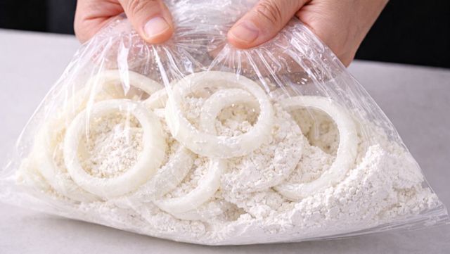 우선, 양파는 1~2개를 준비해 1cm 안팎 두께로 먼저 링 모양으로 썬다. 통째로 칼집을 낸 뒤 자르는 방식보다, 처음부터 링으로 써는 편이 모양이 일정하고 작업이 편하다. 썬 양파는 비닐봉지에 넣고 부침가루를 소량 넣은 뒤 공기를 살짝 머금은 상태로 10초 정도 흔든다. 이 과정에서 양파 표면의 수분에 가루가 고르게 달라붙는다. 별도의 밀가루 그릇이 필요 없고, 가루 뭉침도 줄어든다.
