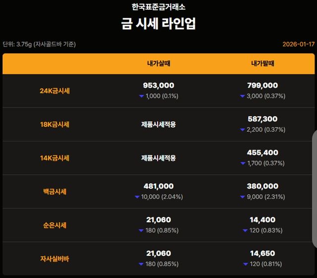 국내 거래소 금시세(금값)가 17일(한국 시각) 오후 하락세(전 거래일 대비)를 보였다.