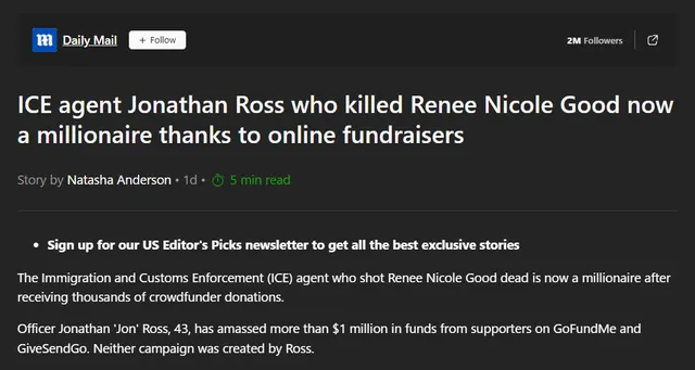 사망자를 테러리스트로 규정하고 그 테러리스트 척결한 용감한 ICE요원에게 기부한단 명목으로 모금.