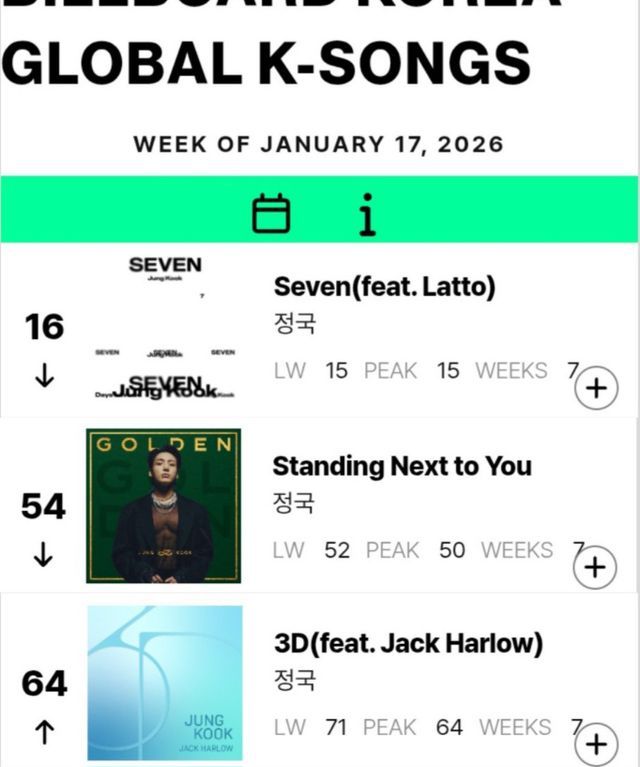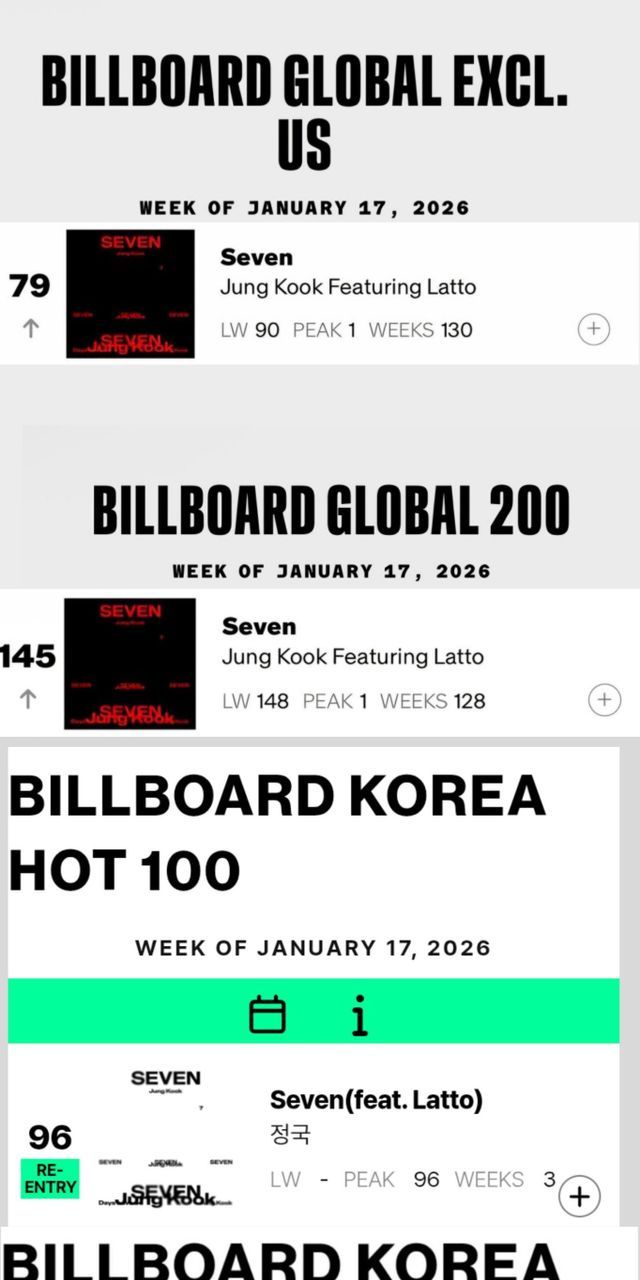 같은 날 집계된 빌보드 ‘글로벌(미국 제외)’ 차트에서도 ‘Seven’은 79위로 11계단 상승했다. 이 차트에서는 아시아 솔로 가수 최초이자 최장 기록인 130주 연속 차트인을 이어가며 존재감을 다시 한 번 확인시켰다.