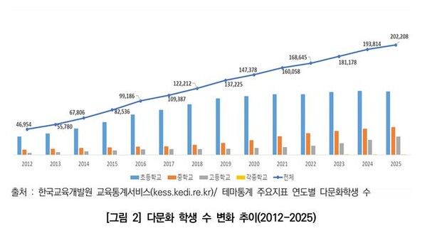 KEDI 교육통계조사 결과에 따르면 초·중등학교의 다문화 학생은 2012년 4만6954명에서 2025년 20만2208명으로 약 4.3배 증가했다.