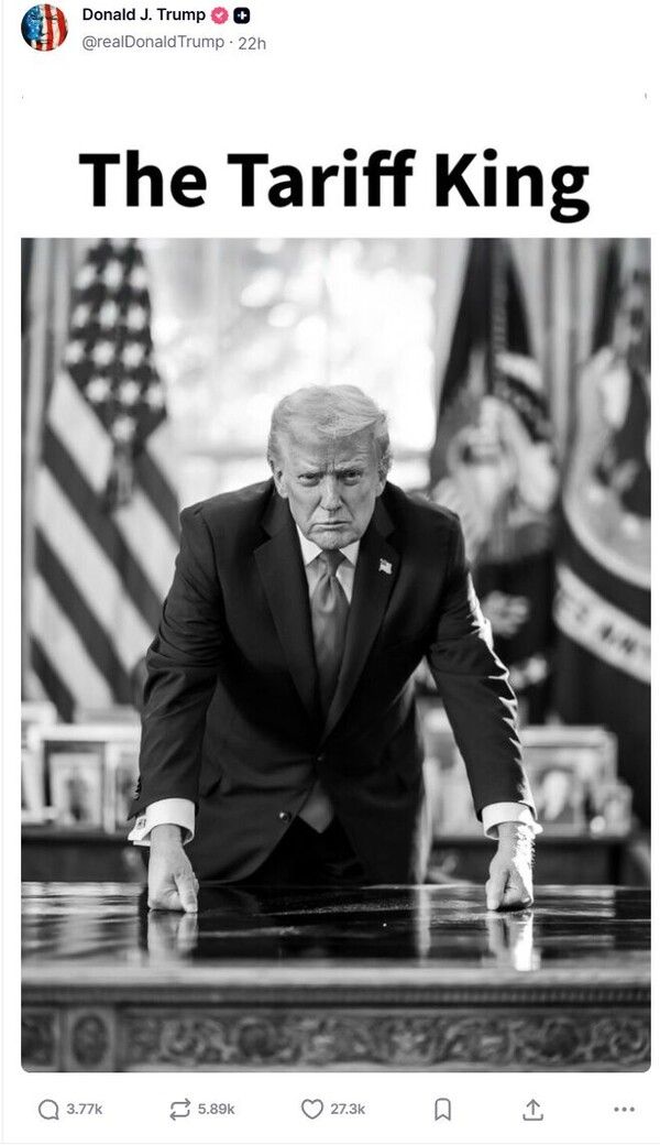 트럼프 대통령은 별도로 같은 사진을 올렸는데, 이번에는 사진 윗부분에 '관세 왕'이라는 문구가 적혔다.