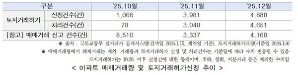 지난해 10월부터 12월까지 접수된 허가 신청 건 가격을 월별로 분석한 결과 10월 20일부터 11월까지 토지거래허가 신청 가격은 10월 실거래가격 대비 1.49% 상승했다. 12월 신청분은 전월 신청가격 대비 1.58% 올라 상승 폭이 확대됐다.