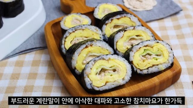 계란에 부친 대파 참치마요를 김밥에 마는 모습. / 유튜브 '집밥 korean home cooking'