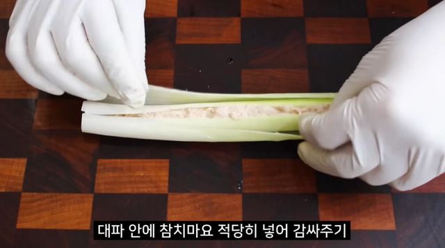 갈라진 대파 흰 부분 가운데 부분에 참치마요를 넣는 모습. / 유튜브 '집밥 korean home cooking'