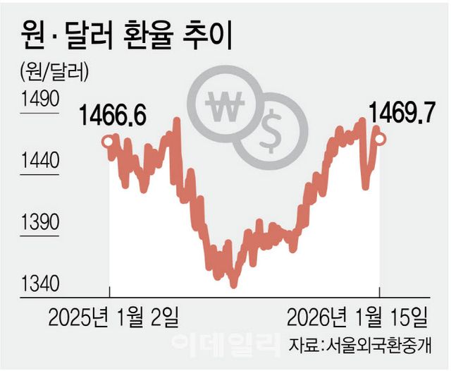 통상 외환당국으로 불리는 한국은행·재정경제부가 아닌 금감원에서도 달러 유동성 조절에 나서는 건 그만큼 원·달러 환율이 높아져서다. 서울외국환중개에 따르면 지난 16일 서울 외환시장에서 원·달러 환율은 1473.6원에 거래를 마쳐 지난해 마지막 개장일인 12월 30일(1439.0원)에 비해 34.6원 올랐다. 특히 지난 8일부터 6거래일 연속으로 환율이 올라 오름세가 진정되지 않고 있다.