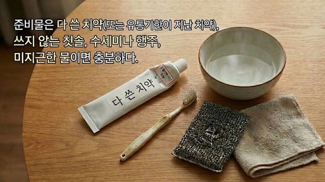 방법은 단순하다. 준비물은 다 쓴 치약(또는 유통기한이 지난 치약), 쓰지 않는 칫솔, 수세미나 행주, 미지근한 물이면 충분하다.