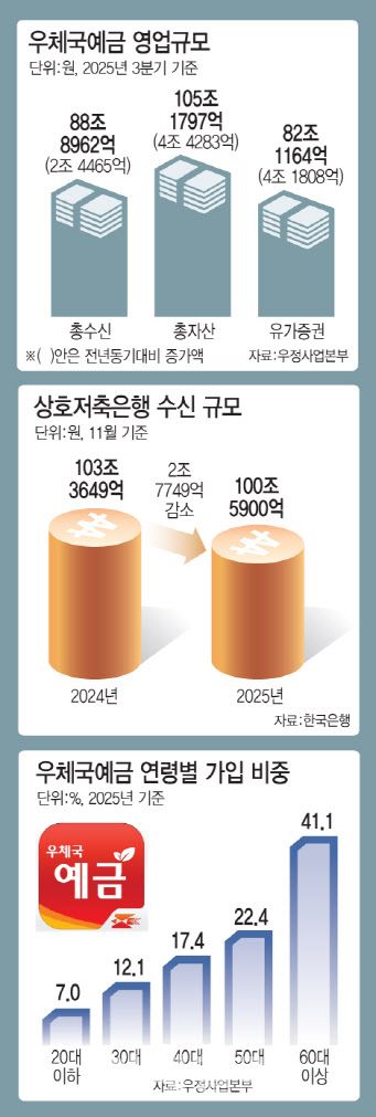 실제로 우체국예금 가입자의 연령 분포를 보면 고령층 비중이 압도적이다. 우정사업본부에 따르면 2025년 기준 우체국예금 가입자 중 60대 이상이 41.1%로 가장 많았고, 50대까지 포함하면 전체의 63.5%에 달했다. 반면 20대 이하와 30대를 합친 비중은 20%에도 못 미쳤다. 모바일·비대면 금융에 익숙한 젊은 층보다 대면 거래를 선호하는 고령층이 우체국예금의 핵심 고객층으로 자리 잡았다는 분석이다.