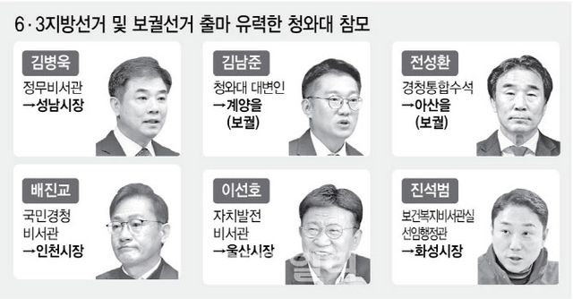 전성환 경청통합수석은 강훈식 실장의 지역구였던 충남 아산 보궐선거 출마 가능성이 거론된다. 과거 지방선거 출마 경험이 있는 만큼 유력 후보군 중 한 명으로 분류되지만, 출마 시점은 불투명하다. 비서관급에서는 정의당 출신인 배진교 국민경청비서관이 인천시장에, 이선호 자치발전비서관이 울산시장에 출마할 것으로 전망된다. 행정관급 참모들의 출마 가능성도 있다. 진석범 보건복지비서관실 선임행정관은 경기 화성시장에, 김광 자치발전비서관실 행정관은 인천 계양구청장에 출사표를 낼 것으로 예상된다. 정치권에서는 청와대 인사 개편은 이르면 2월 중 본격화될 가능성이 크다고 본다.